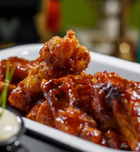 Una deliciosa orden de alitas bañadas en las mejores salsas del Chef. BBQ, picositas, al tamarindo o mango habanero.